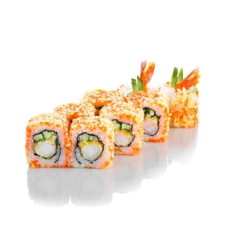 Состав: рис,нори,креветка темпура,спайс соус,тобико,огурец,кунжут. Вес: 215г