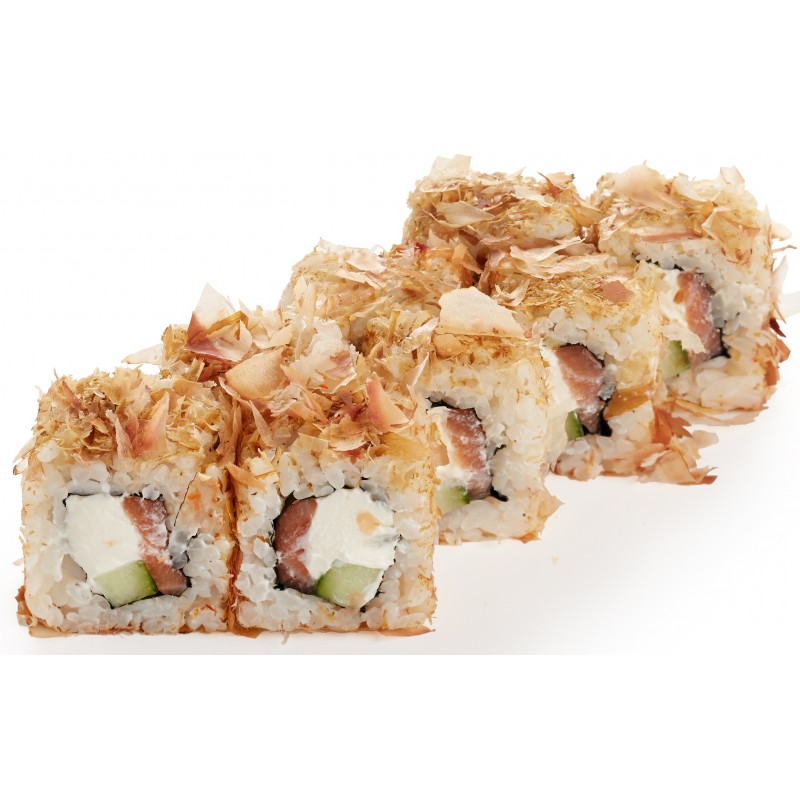 Состав: рис,нори,лосось жареный,огурец,сыр...