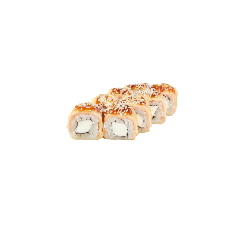 Состав: рис,нори,сыр сливочный.лосось обжареный,соус унаги,кунжут.