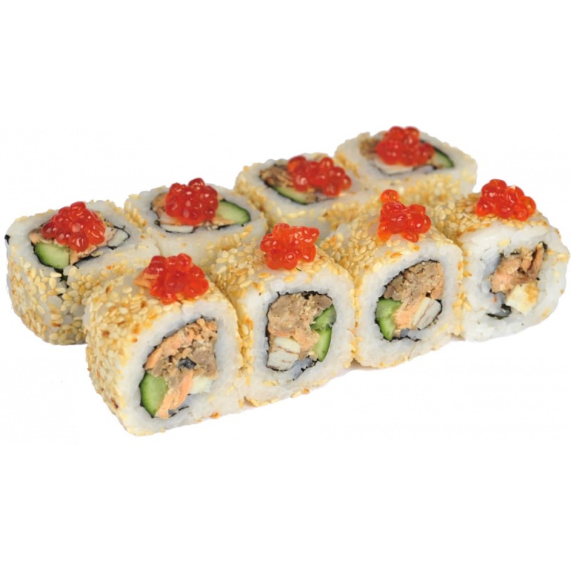 Состав: рис,нори,лосось жареный,омлет,огурец,икра лососевая,кунжут. Вес: 220г.