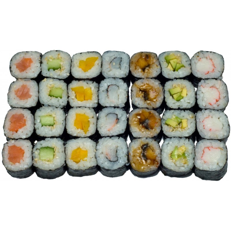 сяке маки 1/2, каппа маки 1/2, эби маки 1/2, с редькой 1/2, унаги маки 1/2, с авокадо 1/2, ика маки 1/2. 28 шт.