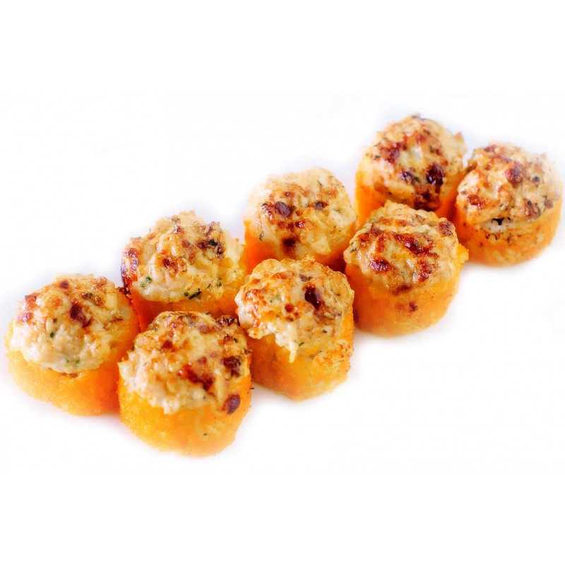 угорь копченый, авокадо, сыр сливочный, огурец, тобико, запеченный под шапочкой из сыра моцарелла. Вес: 240 г.